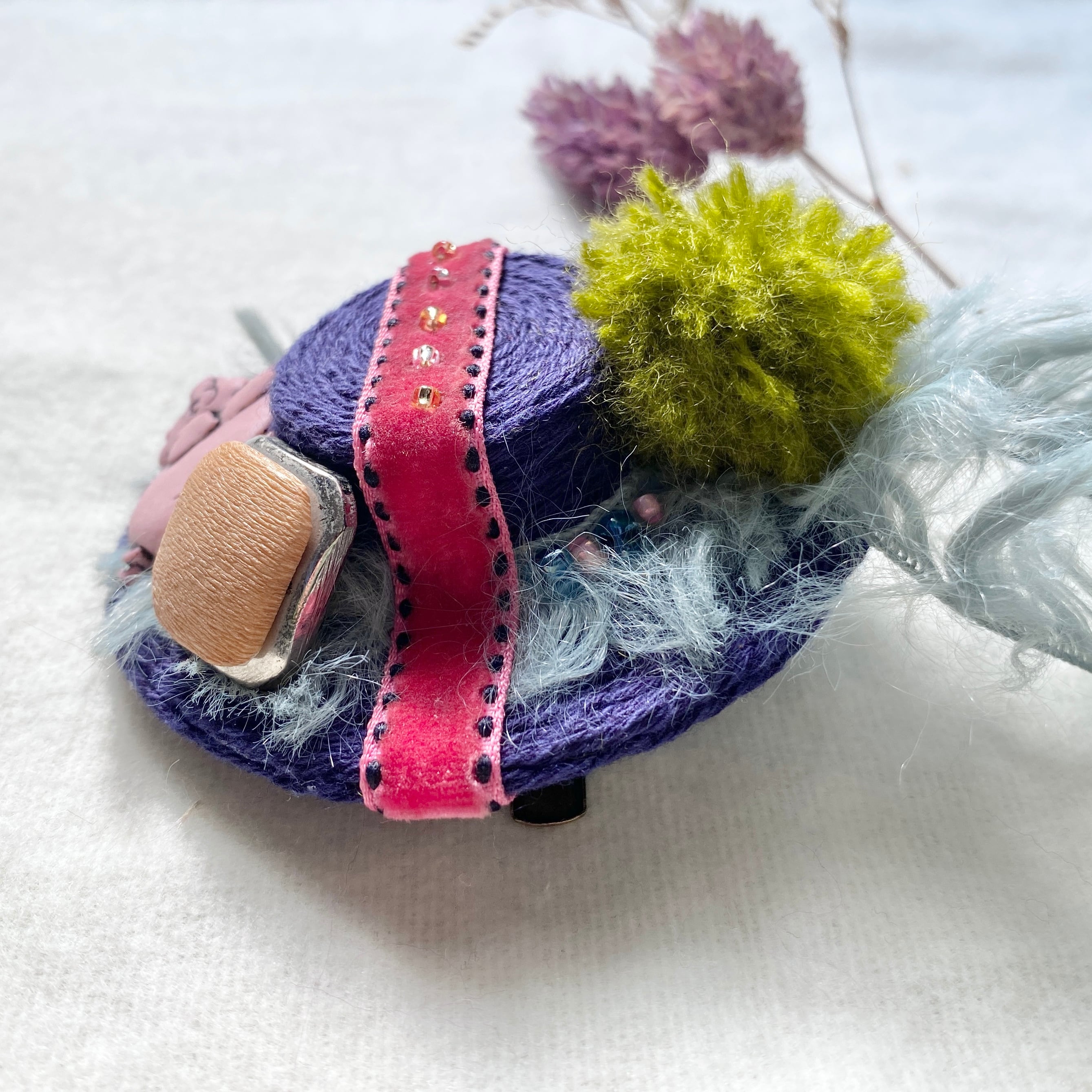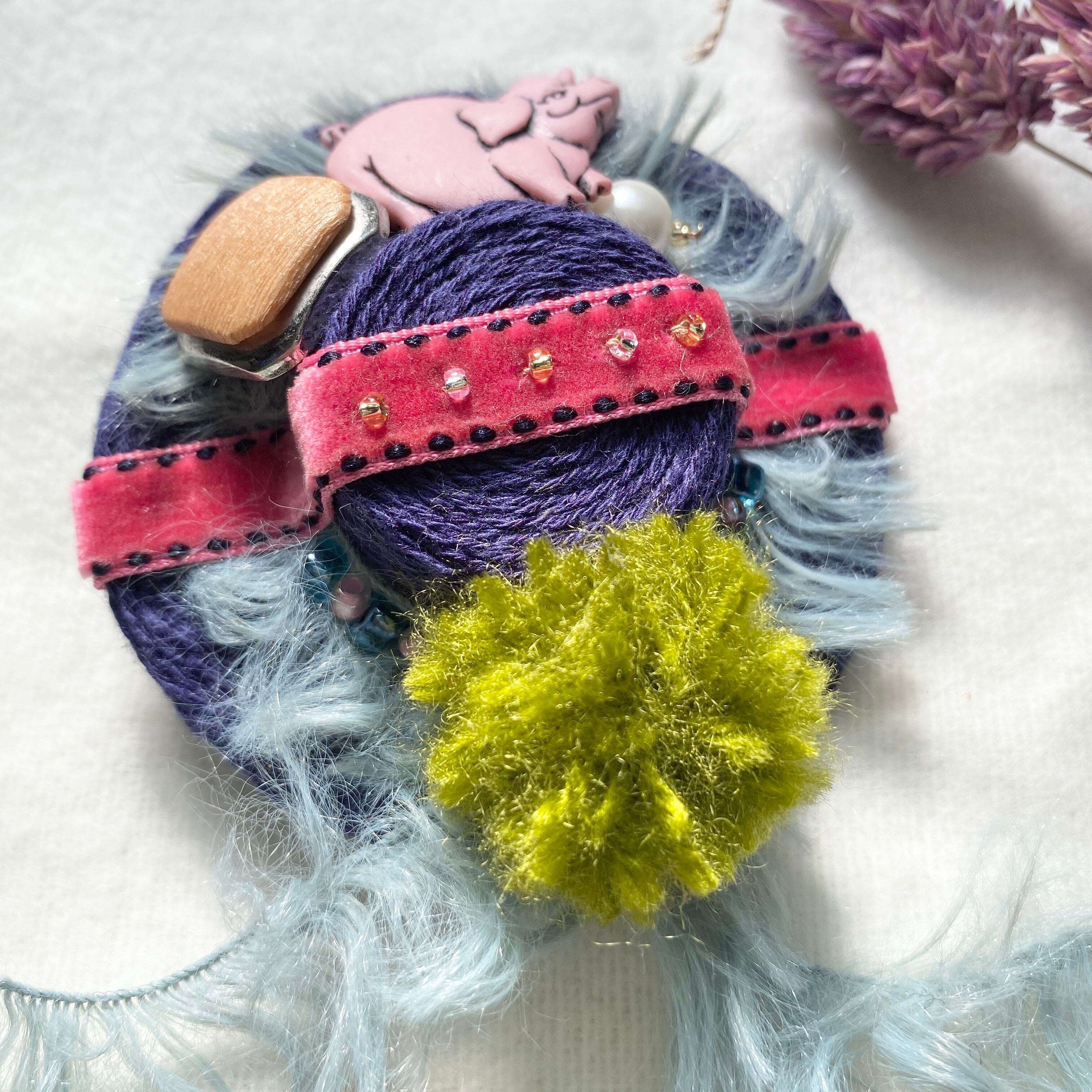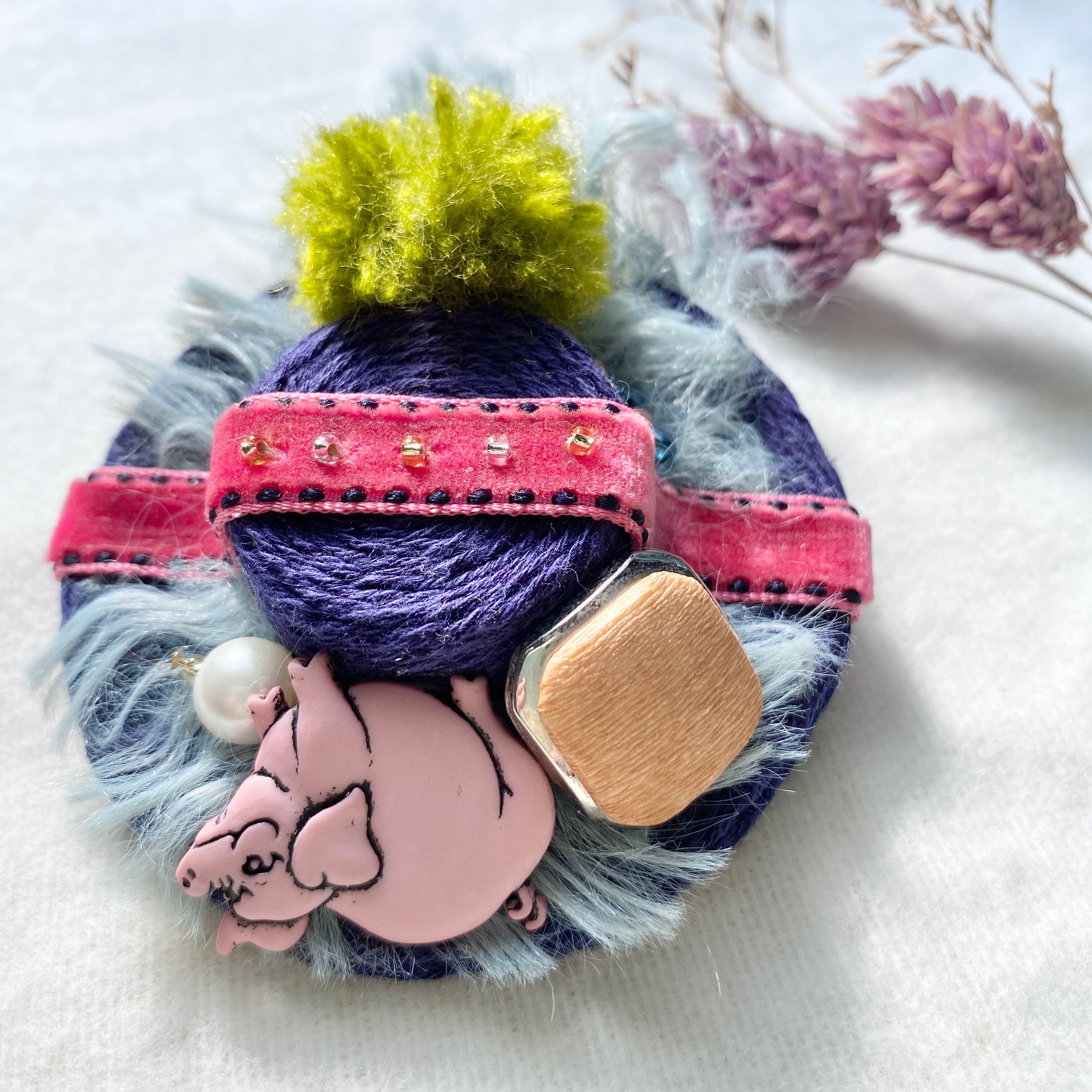 ブタちゃんと真珠をふわふわの飾りと一緒に帽子の上にデコレートしたかわいいブローチ