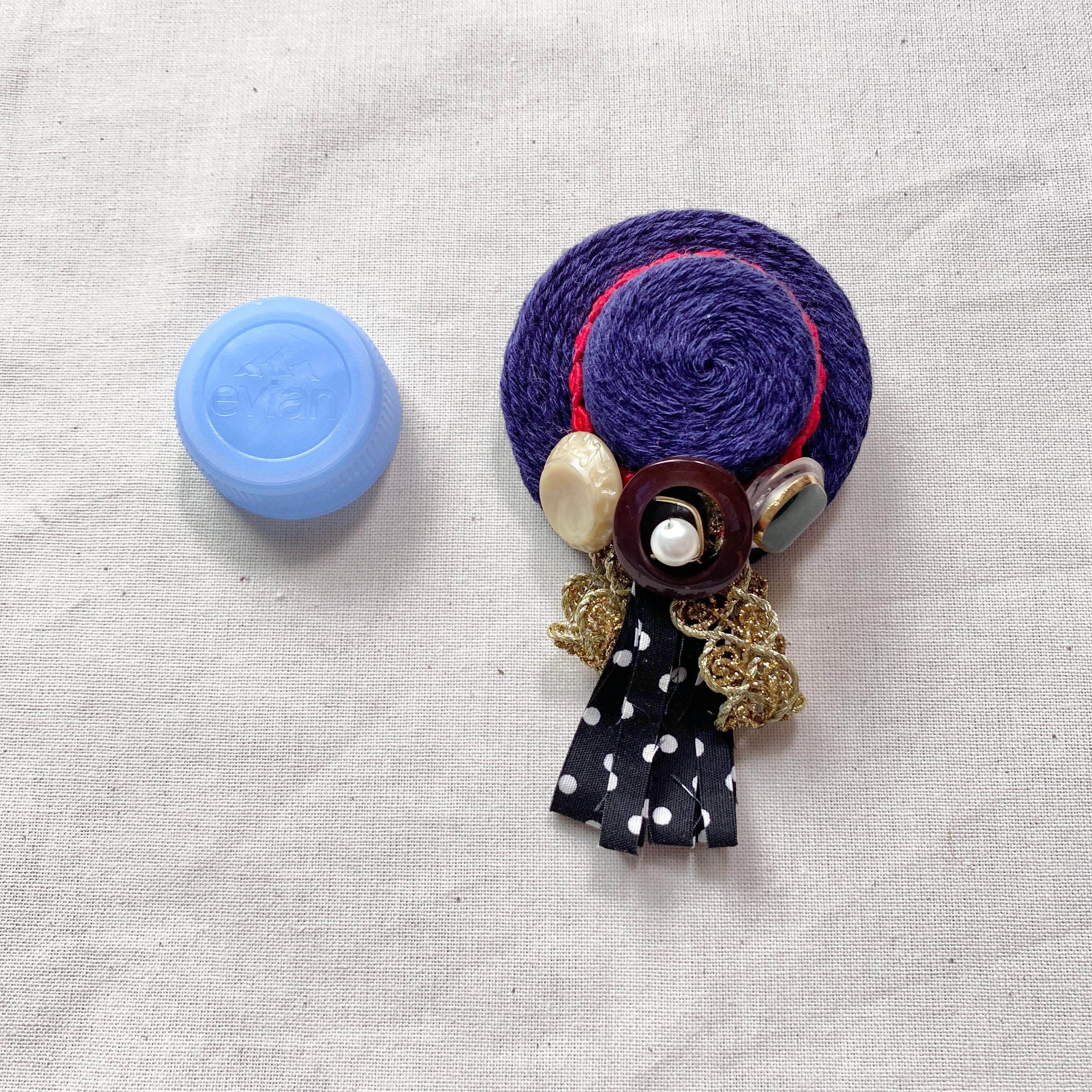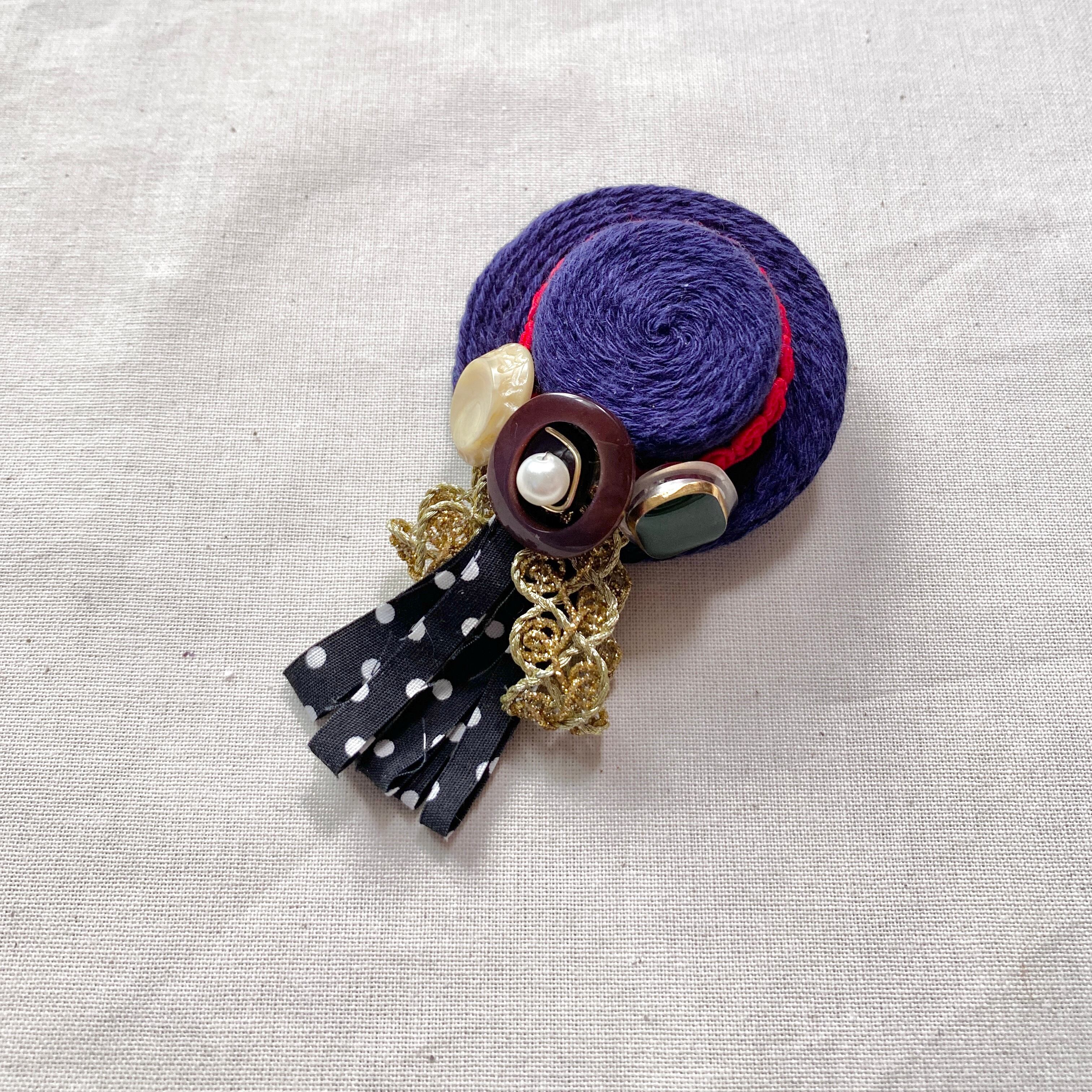 ドット柄の細いリボンにヴィンテージボタンを組み合わせたレトロな小さな帽子ブローチ