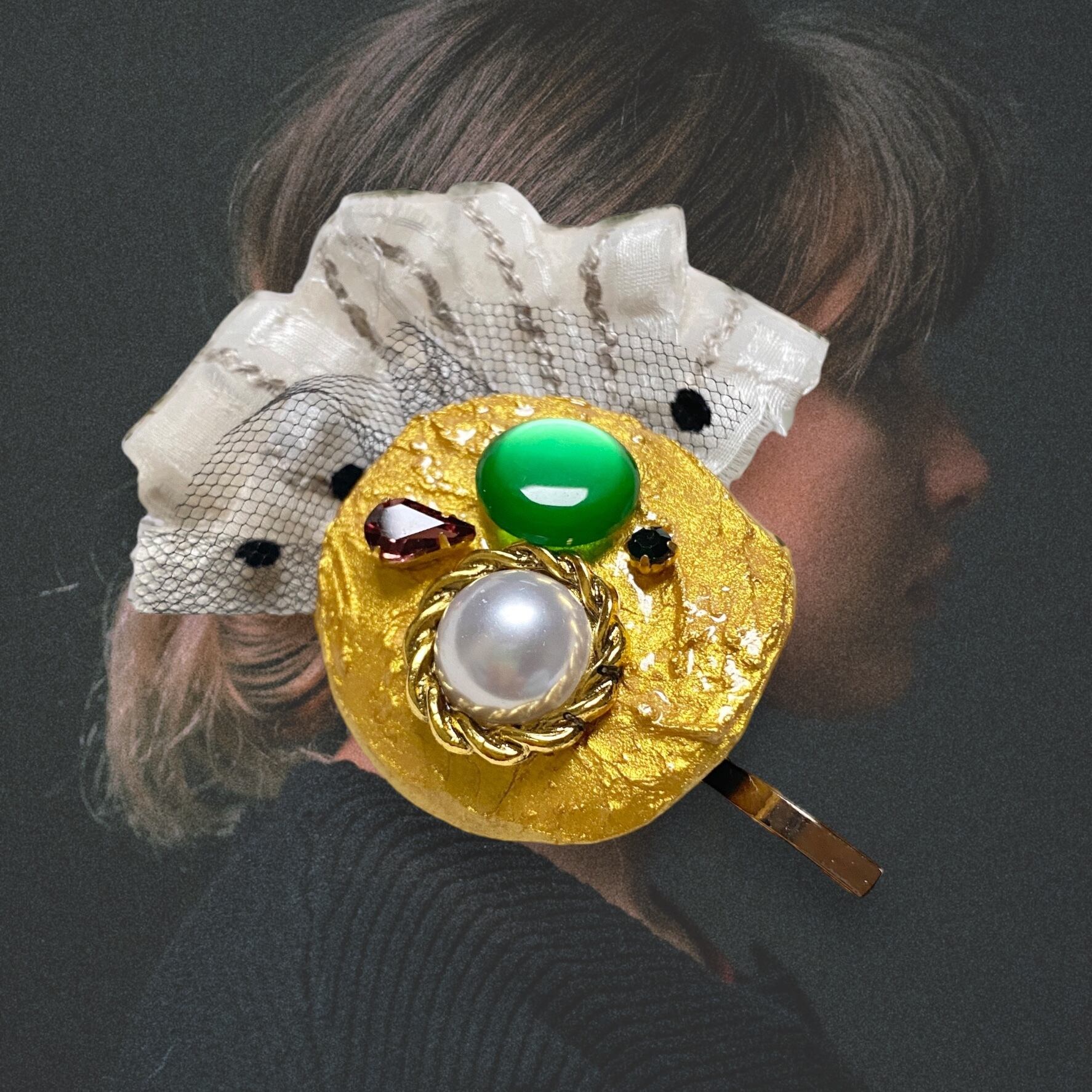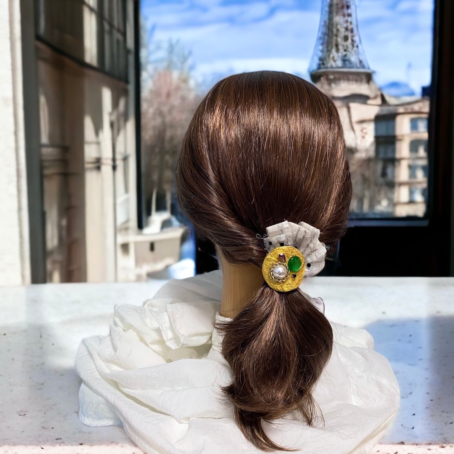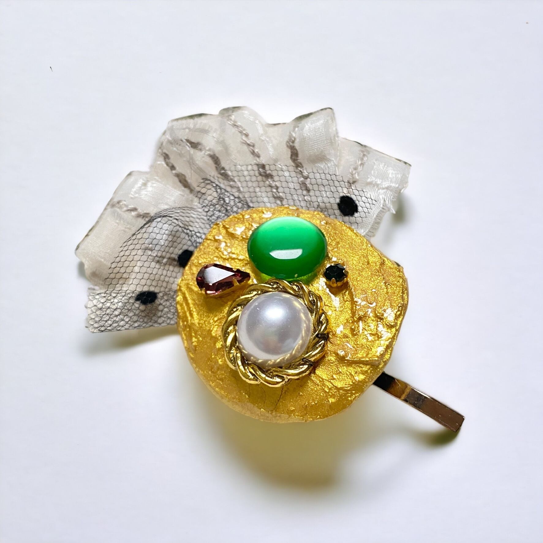 インポート生地のハギレをリボンに用い、ヴィンテージ感漂うポニーフックに仕上げました♪