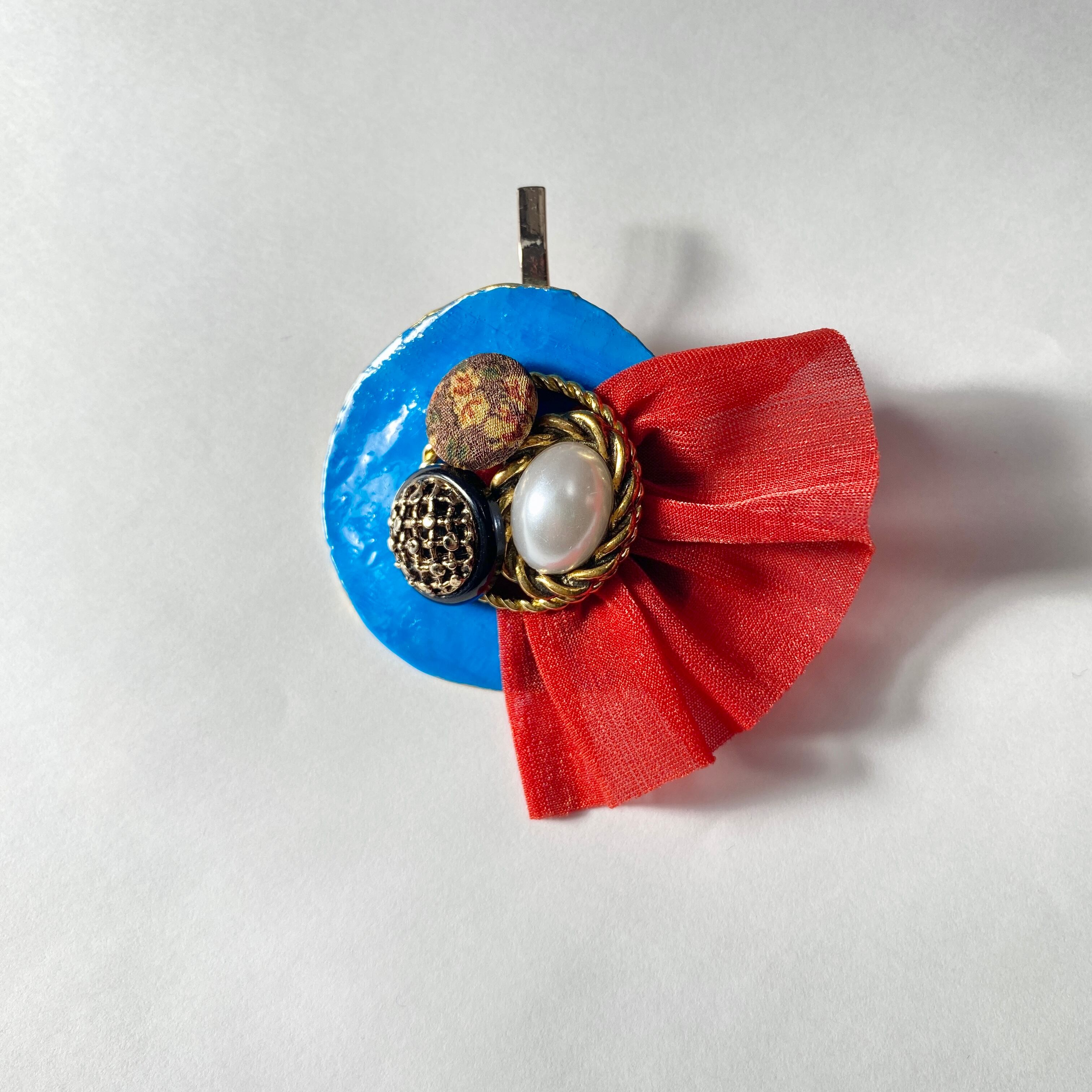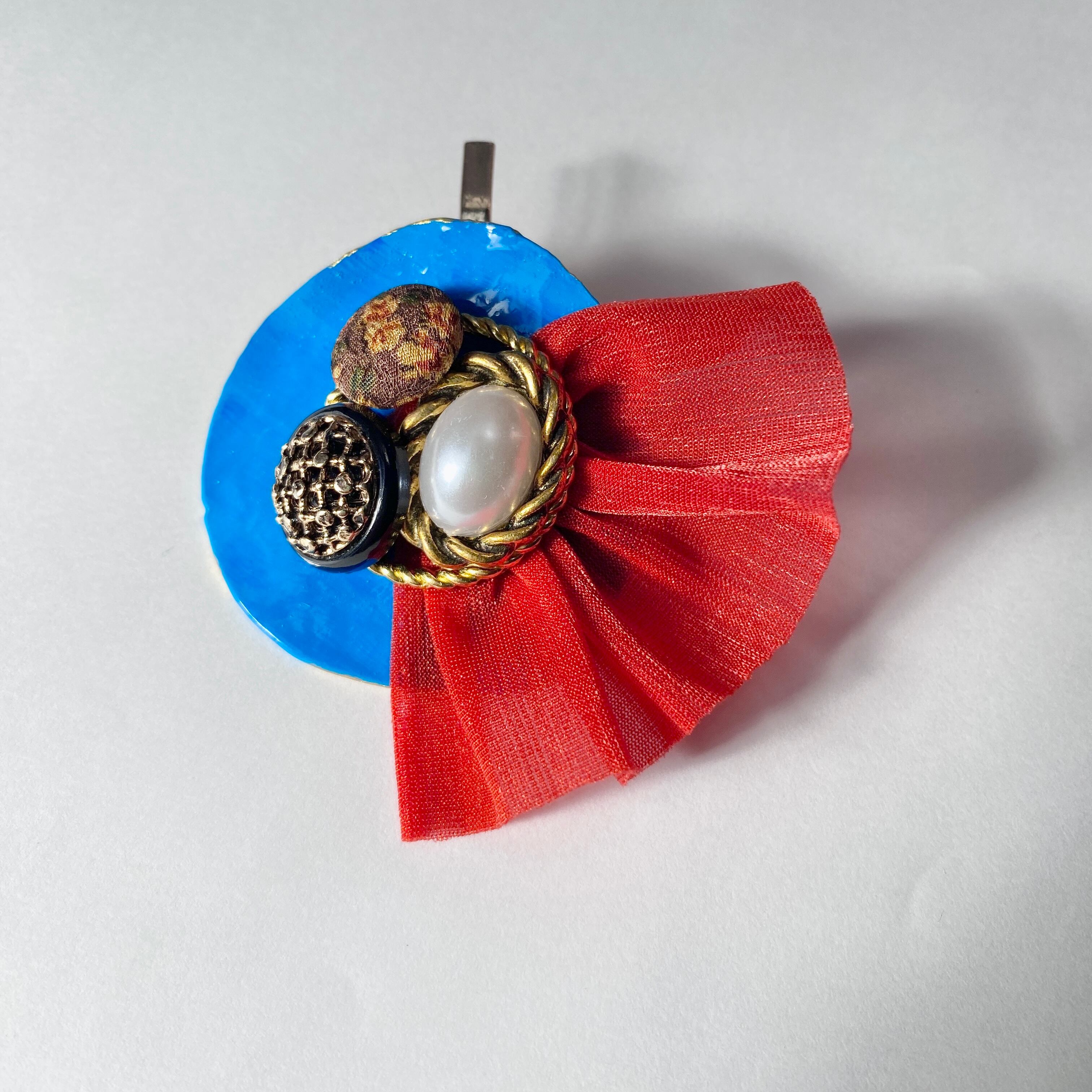 スカイブルーに朱色のヒラヒラ生地を組み合わせたレトロなヘアカフ