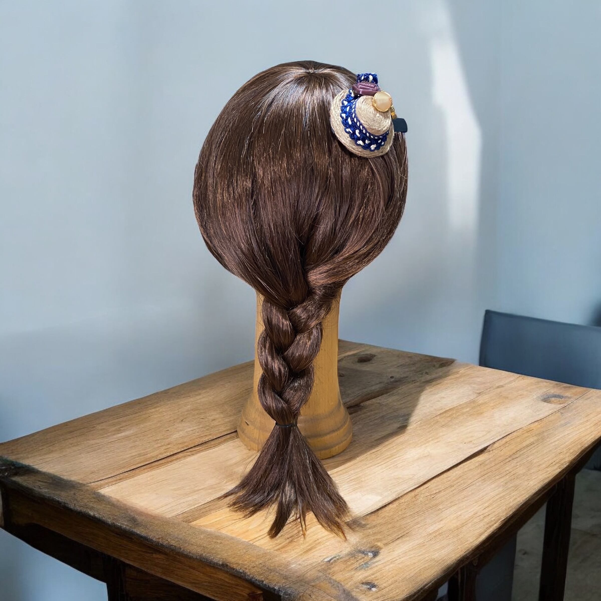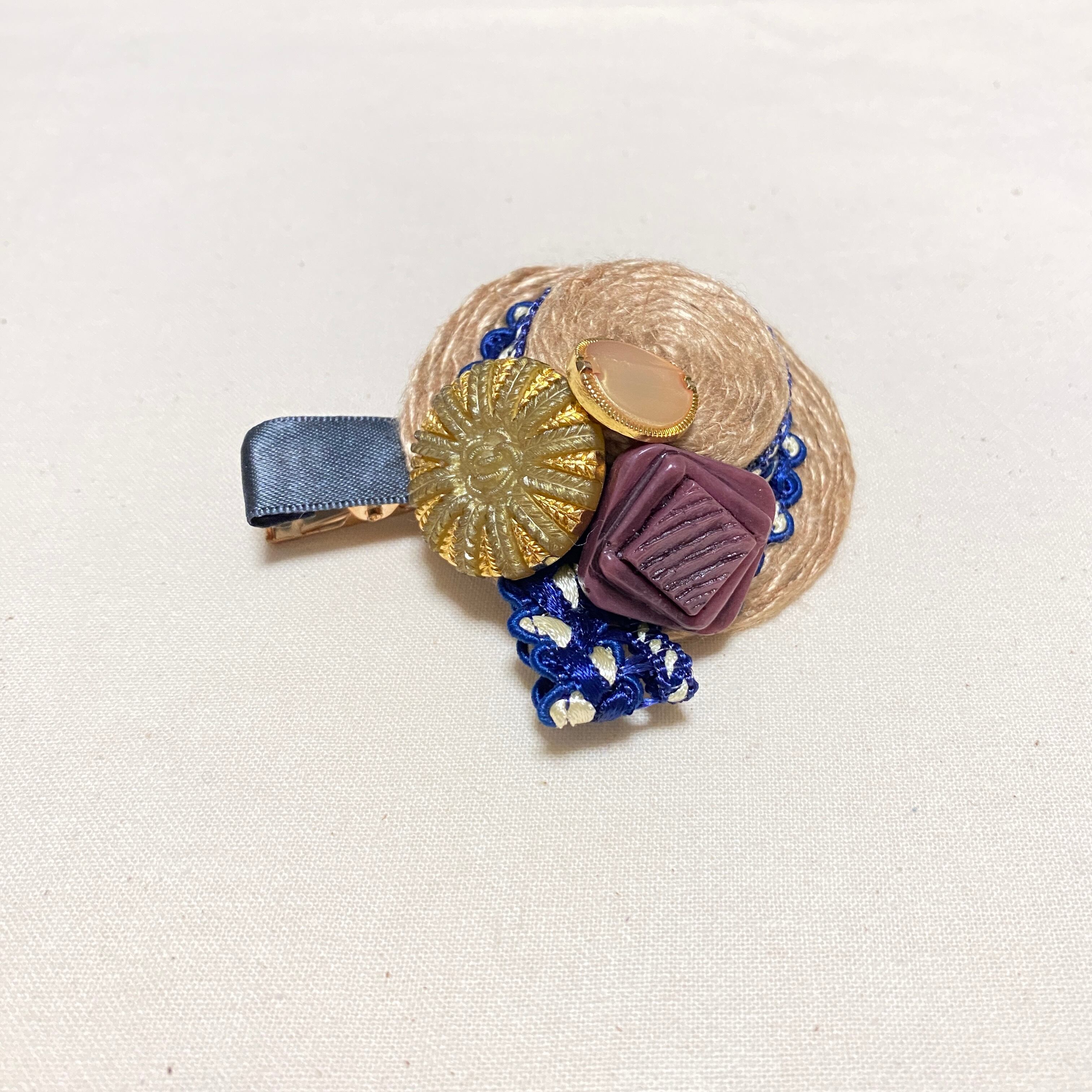 ⌘落ち着きのあるネイビーリボンにフルーツとチョコレートをイメージさせるヴィンテージボタンを組み合わせ、大人っぽさと遊び心をMIXさせた小さな帽子クリップ⌘