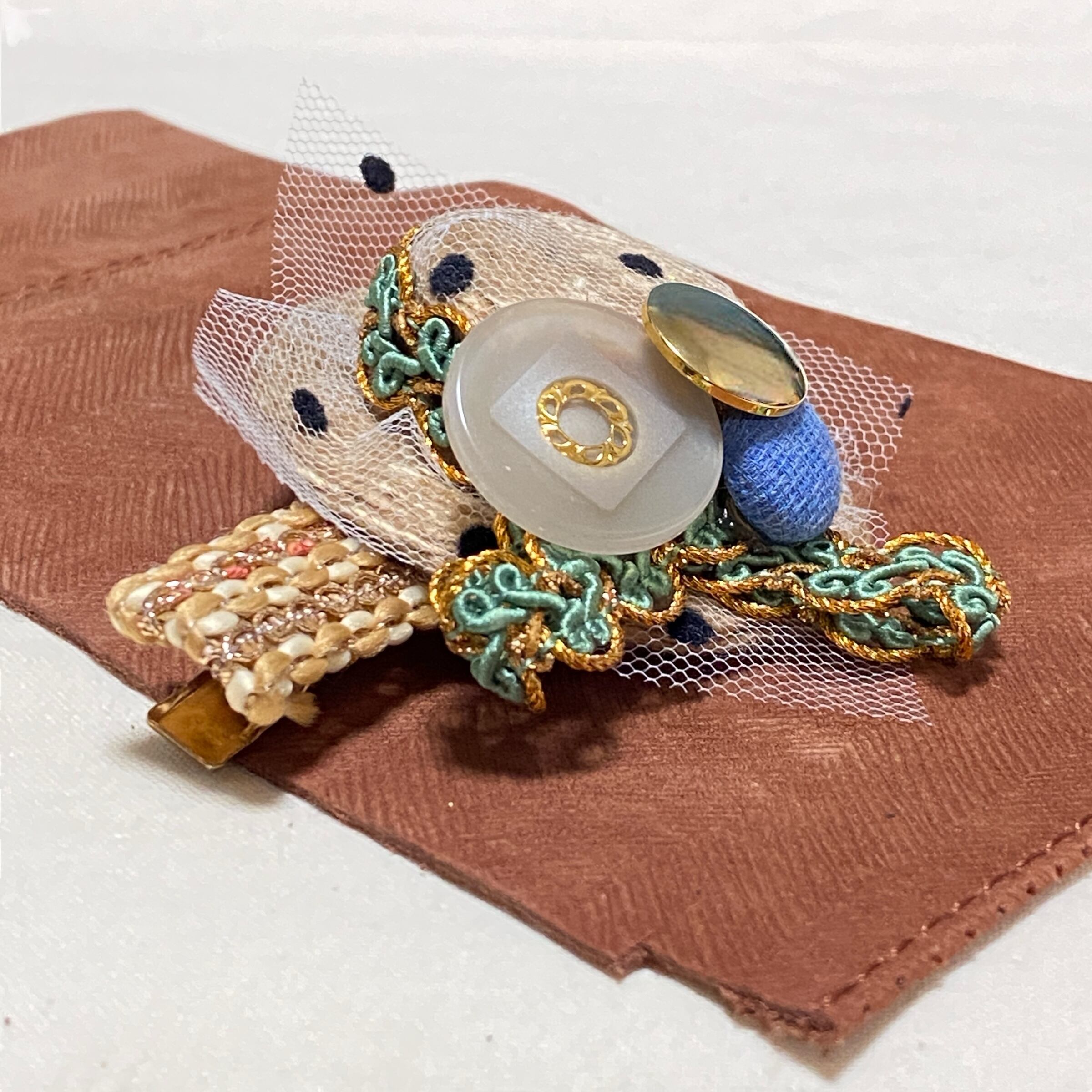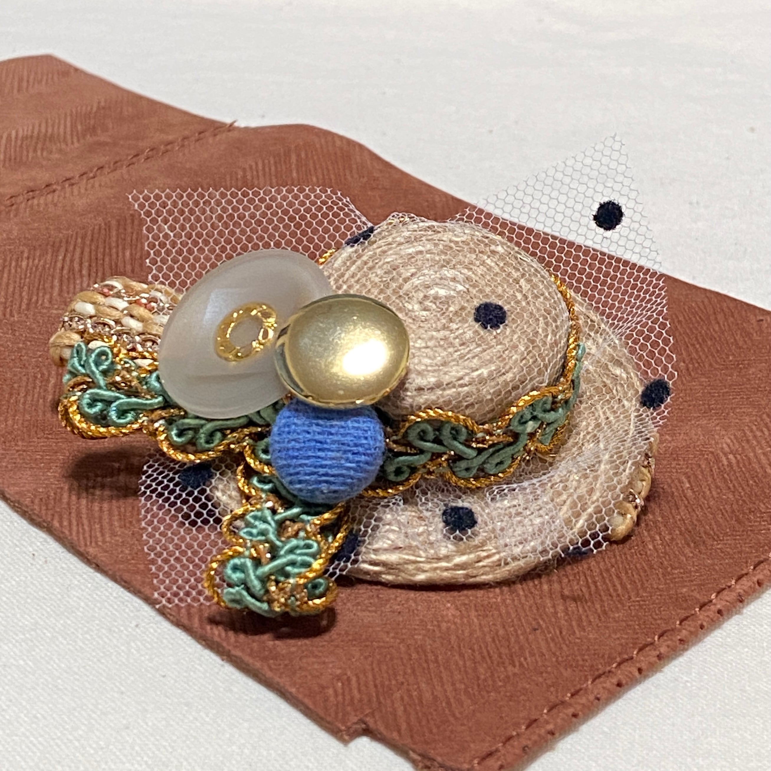 ⌘ドットチュールを纏ったコロンと小さな帽子ブローチ。ナチュラルベースのカラーにヴィンテージボタンたちがレトロなアクセントになってます⌘